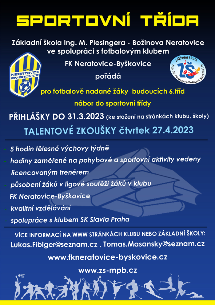 Sportovní příprava hráčů ve Sportovním středisku mládeže je nedílnou součástí výchovně - vzdělávacího procesu a také pevnou složkou koncepce našeho klubu. Z toho vyplývá, že prioritní hledisko práce se sportovně talentovanou mládeží by mělo vycházet z plnění školních povinností v propojení se sportovní přípravou v SpSM. Je nespornou výhodou, že hráči mají možnost spojit školní výuku se sportovní, v našem případě fotbalovou. Po celou dobu pobytu ve škole, nebo na tréninku jsou hráči pod dohledem pedagogů a trenérů. Pro řešení kázeňských přestupků je nastavena komunikace směrem učitel - hlavní trenér SpSM a naopak. Naší snahou je spolupodílet se na výchově silných jedinců, kteří se snaží zodpovědně přistupovat ke svým povinnostem a zadaným úkolům. Vedení ZŠ Ing. Plesingera - Božinova a FK Neratovice - Byškovice budují školu, na kterou jeho absolvent bude vzpomínat v dobrém a nebude mít nikdy pocit, že ho fotbal limitoval v jeho dalším studiu. Statut sportovní střediska mládeže získal náš klub splněním kritérií určených FAČR v roce 2020. SpSM je určeno pro žákovskou kategorii a klub musí splňovat několik důležitých kritérií. Mezi hlavní kritéria je kvalita žákovských soutěží, počet mužstev, podmínky pro trénink (plochy, zázemí), kvalifikovaní trenéři, zajištění zdravotní péče o hráče - 1x ročně povinné komplexní zdravotní prohlídky.